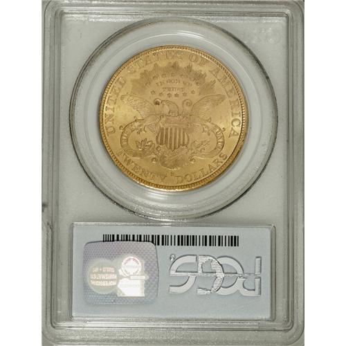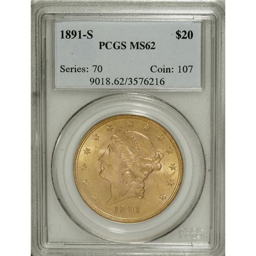 <B>1891-S $20 MS62 PCGS.</B></I> Medium S. Variegated mint-green and peach toning adorns the satiny surfaces. Die doubling is noticeable on the lower reverse arrows and lettering. Several small marks reside on Liberty's cheek.<BR><BR><b>Shipping:</b> Coins & Currency (<a target="_blank" href="http://www.heritageauctions.com/common/shipping.php">view shipping information</a>)