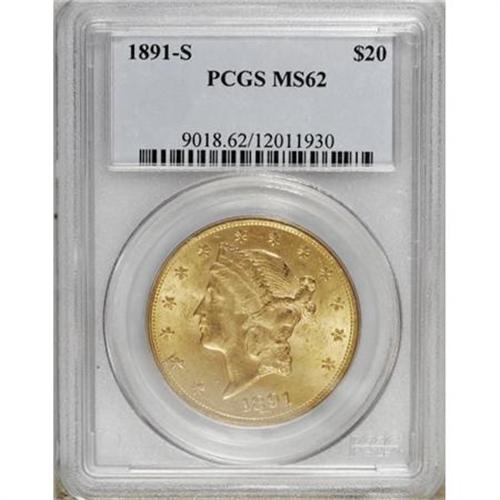 <B>1891-S $20 MS62 PCGS.</B></I> PCGS Population (1408/674). NGC Census: (1514/427). Mintage: 1,288,125. Numismedia Wsl. Price for NGC/PCGS coin in MS62: $765. (#9018)<BR><BR><B>Coin Engraver:</B> James B. Longacre<BR><BR><b>Shipping:</b> Coins & Currency (<a target="_blank" href="http://www.heritageauctions.com/common/shipping.php">view shipping information</a>)