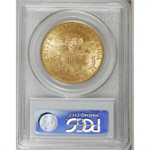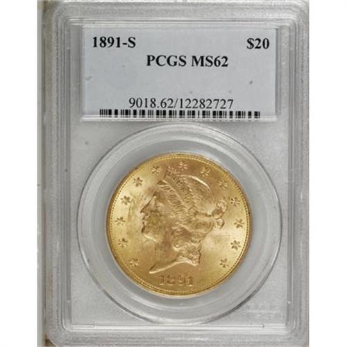 <B>1891-S $20 MS62 PCGS.</B></I> . PCGS Population (1449/681). NGC Census: (1539/432). Mintage: 1,288,125. Numismedia Wsl. Price for NGC/PCGS coin in MS62: $1,065. (#9018)<BR><BR><B>Coin Engraver:</B> James B. Longacre<BR><BR><b>Shipping:</b> Coins & Currency (<a target="_blank" href="http://www.heritageauctions.com/common/shipping.php">view shipping information</a>)