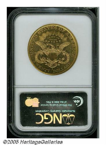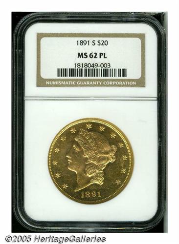 <B>1891-S<$20> MS62 Prooflike NGC.</B></I> A boldly struck and moderately abraded prooflike Liberty Twenty. The eye appeal is pleasant for the grade. Among five pieces certified as Prooflike by NGC (5/05), the present example is the single highest graded.