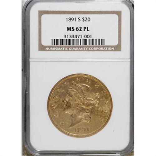<B>1891-S $20 MS62 Prooflike NGC.</B></I> Apricot-gold surfaces display pleasing field-motif contrast and a sharp strike. Scattered contact marks and luster grazes limit the grade. Census: 4 in 62 Prooflike, 0 finer (1/08).<BR><BR><B>Coin Engraver:</B> James B. Longacre<BR><BR><b>Shipping:</b> Coins & Currency (<a target="_blank" href="http://www.heritageauctions.com/common/shipping.php">view shipping information</a>)
