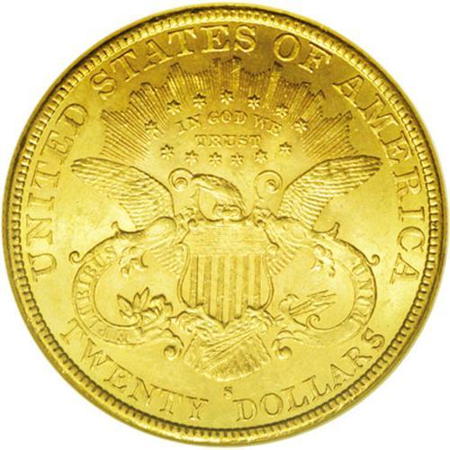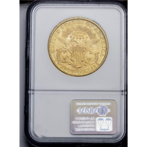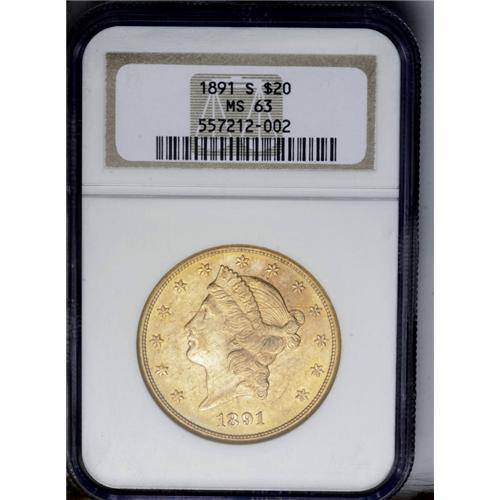 <B>1891-S<$20> MS63 NGC.</B></I> A common S-mint twenty Liberty and usually found well struck and with good luster. This is a particularly attractive coin that has frosted mint luster and an overlay of orange-golden patina on each side. Sharply struck.