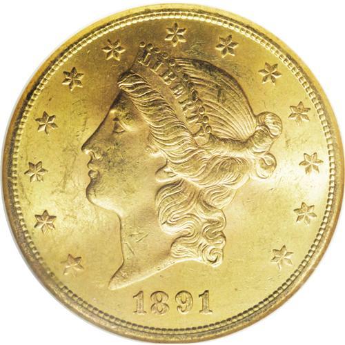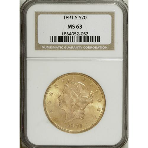 <B>1891-S $20 MS63 NGC.</B></I> Rich luster invigorates the nicely preserved surfaces of this Select Mint State double eagle. Lovely mint-green and rose toning increases the eye appeal. The 1891-S is a very common date from MS60 to MS62 that becomes a bit scarcer at MS63, and very scarce any finer.<BR><BR><b>Shipping:</b> Coin/Currency (<a target="_blank" href="http://www.heritageauctions.com/common/shipping.php">view shipping information</a>)
