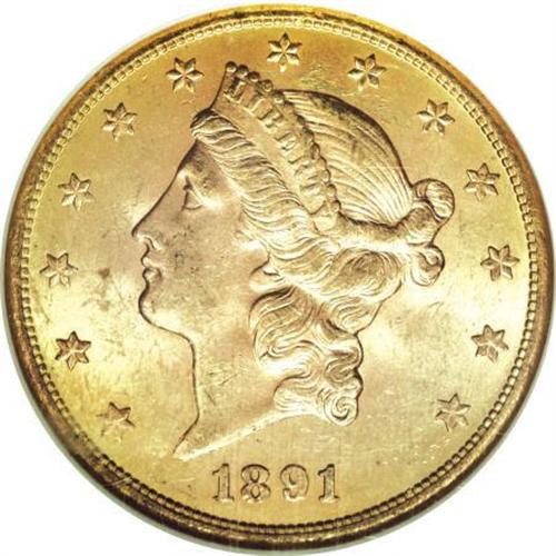 <B>1891-S $20 MS63 NGC.</B></I> Rich luster invigorates the nicely preserved surfaces of this Select Mint State double eagle. Lovely mint-green and rose toning increases the eye appeal. The 1891-S is a very common date from MS60 to MS62 that becomes a bit more challenging at MS63, and very scarce any finer. <BR><BR><B>Coin Engraver:</B> James B. Longacre<BR><BR><b>Shipping:</b> Coins & Currency (<a target="_blank" href="http://www.heritageauctions.com/common/shipping.php">view shipping information</a>)