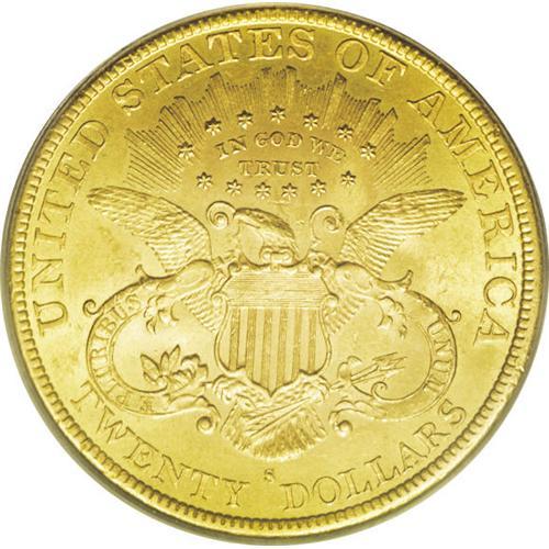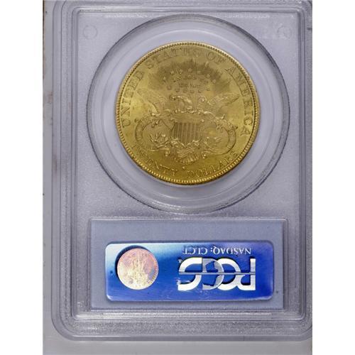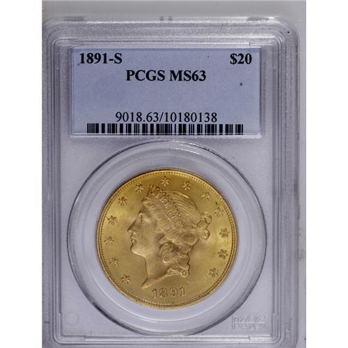 <B>1891-S<$20> MS63 PCGS.</B></I> An issue that is available in Mint State grades through MS63, but rare finer. The smoky-gold surfaces show slightly subdued luster, but are quite clean and distraction-free for the grade. The strike is pleasingly bold, although not entirely full on the highest points of Liberty's hair. Liberty's cheek is especially free of major contact.