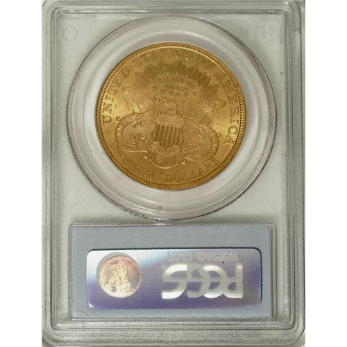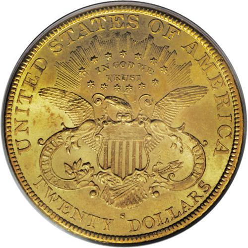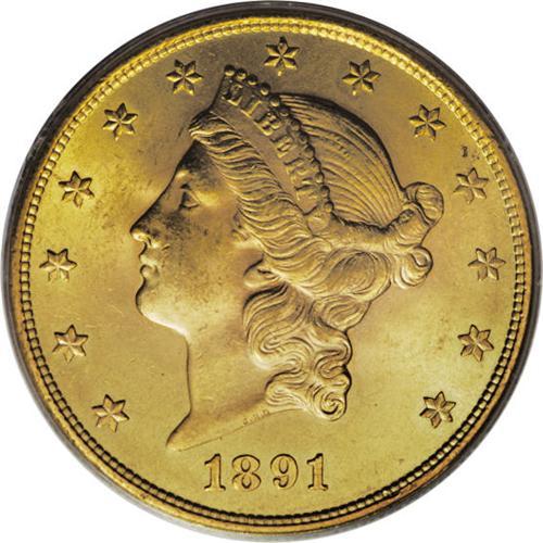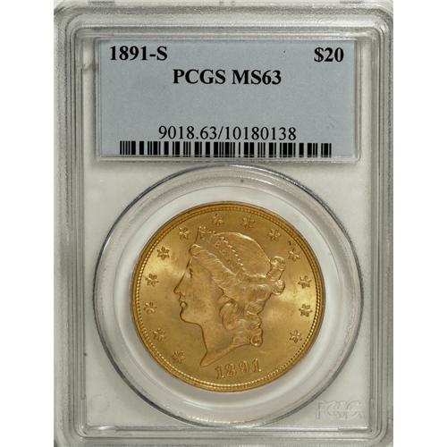 <B>1891-S $20 MS63 PCGS.</B></I> An issue that is available in Mint State grades through MS63, but rare finer. The smoky-gold surfaces show slightly subdued luster, but are quite clean and distraction-free for the grade. The strike is pleasingly bold, although not entirely full on the highest points of Liberty's hair. Liberty's cheek is especially free of major contact.<BR><BR><b>Shipping:</b> Coins & Currency (<a target="_blank" href="http://www.heritageauctions.com/common/shipping.php">view shipping information</a>)