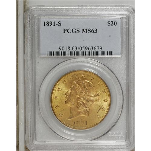 <B>1891-S $20 MS63 PCGS.</B></I> Exquisitely struck, with orange-gold patina laced with wisps of tan. Lustrous surfaces reveal a few minor marks scattered about.<BR><BR><b>Shipping:</b> Coins & Currency (<a target="_blank" href="http://www.heritageauctions.com/common/shipping.php">view shipping information</a>)