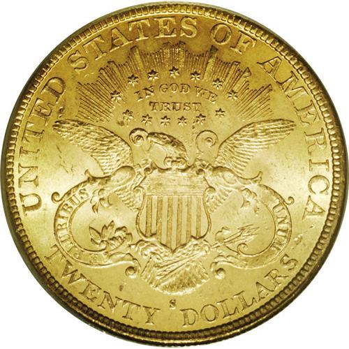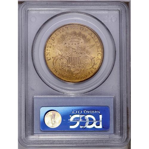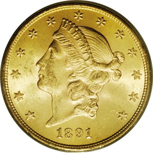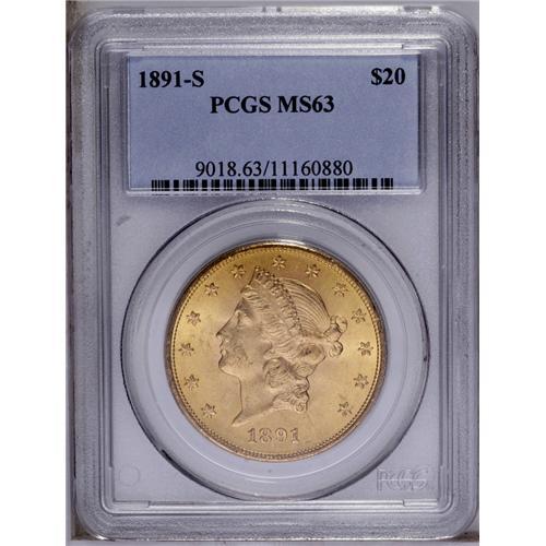 <B>1891-S<$20> MS63 PCGS.</B></I> Frosty and fully lustrous with rich yellow-gold color and olive toning highlights. This is a pleasing example that is finer than most examples. Boldly struck with sharp central obverse and reverse details. <BR><BR><B>Important notice:</B> Heritage usually auctions material at the rate of 200-250 lots per hour. On some occasions eBay Live bid software or the Internet may not be able to keep up with the pace of the auction. We recommend placing a realistic absentee bid now as insurance to avoid disappointment. Occasionally the auctioneer may eliminate or reject an eBay Live bid, and the auctioneer may also reopen a lot after the close of the eBay live bidding (usually because we missed an audience bid), and may reject your bid even if it shows you as the winning bidder. By bidding via eBay Live, you agree that Heritage may award the lot to another bidder at its sole discretion under the circumstances described above or any other reasonable circumstances. Since eBay bids are not shown to us until we open the lot on the floor, we treat those bids just like floor bids. In most cases the floor responds before the eBay bid is presented to us, due to Internet lag time, so for consistency we have made it a policy that floor bids are always considered first over tie eBay live bids. Also please note that all Heritage lots purchased through eBay Live carry a 20% Buyer's Premium. Please make sure you read the Terms and Conditions before you bid. This lot is being auctioned in conjunction with a live floor auction by Heritage Galleries & Auctioneers. All final auction and invoice information will be supplied by Heritage Galleries & Auctioneers, and all other information should be considered preliminary. Lot:4331 <BR><BR><B>Winning Notification and Billing:</B> After the FINAL session in this auction is complete, Heritage will send e-mail and snail mail invoices. This process normally takes several days. All final auction and invoice information will be supplied by Heritage Galleries & Auctioneers, and all other information should be considered preliminary. <BR><BR>This auction will be conducted on a live auction floor and over the Internet through eBay Live. If you choose to place an absentee bid, please take a moment to <font color='#0000ff'><u><a href='http://pages.ebay.com/liveauctions/help/before/laabsentee.html'>learn how eBay Live absentee bidding works</a></u></font><font color='#000000'>