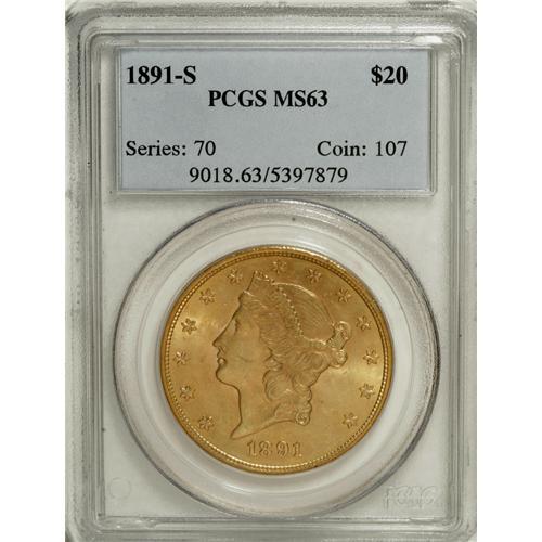 <B>1891-S $20 MS63 PCGS.</B></I> Medium S. Splendid peach and sea-green toning combines with vivacious luster to provide pleasing eye appeal. There are no obtrusive marks, and the strike is good despite minor highpoint blending within Liberty's hair. A charming example of this conditionally scarce issue. PCGS has only certified 66 finer examples of this issue (4/07).<BR><BR><b>Shipping:</b> Coins & Currency (<a target="_blank" href="http://www.heritageauctions.com/common/shipping.php">view shipping information</a>)