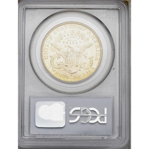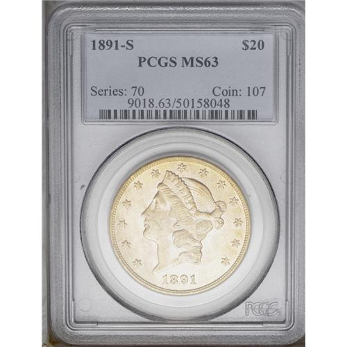 <B>1891-S<$20> MS63 PCGS.</B></I> The obverse of this normally heavily abraded issue exhibits shimmering luster and is remarkably smooth, while field marks on the reverse are both larger and more abundant. Subtle reddish patina highlights both sides. <BR><BR><B>Important notice:</B> Heritage usually auctions material at the rate of 200-250 lots per hour. On some occasions eBay Live bid software or the Internet may not be able to keep up with the pace of the auction. We recommend placing a realistic absentee bid now as insurance to avoid disappointment. Occasionally the auctioneer may eliminate or reject an eBay Live bid, and the auctioneer may also reopen a lot after the close of the eBay live bidding (usually because we missed an audience bid), and may reject your bid even if it shows you as the winning bidder. By bidding via eBay Live, you agree that Heritage may award the lot to another bidder at its sole discretion under the circumstances described above or any other reasonable circumstances. Since eBay bids are not shown to us until we open the lot on the floor, we treat those bids just like floor bids. In most cases the floor responds before the eBay bid is presented to us, due to Internet lag time, so for consistency we have made it a policy that floor bids are always considered first over tie eBay live bids. Also please note that all Heritage lots purchased through eBay Live carry a 20% Buyer's Premium. Please make sure you read the Terms and Conditions before you bid. This lot is being auctioned in conjunction with a live floor auction by Heritage Galleries & Auctioneers. All final auction and invoice information will be supplied by Heritage Galleries & Auctioneers, and all other information should be considered preliminary. Lot:4333 <BR><BR><B>Winning Notification and Billing:</B> After the FINAL session in this auction is complete, Heritage will send e-mail and snail mail invoices. This process normally takes several days. All final auction and invoice information will be supplied by Heritage Galleries & Auctioneers, and all other information should be considered preliminary. <BR><BR>This auction will be conducted on a live auction floor and over the Internet through eBay Live. If you choose to place an absentee bid, please take a moment to <font color='#0000ff'><u><a href='http://pages.ebay.com/liveauctions/help/before/laabsentee.html'>learn how eBay Live absentee bidding works</a></u></font><font color='#000000'>