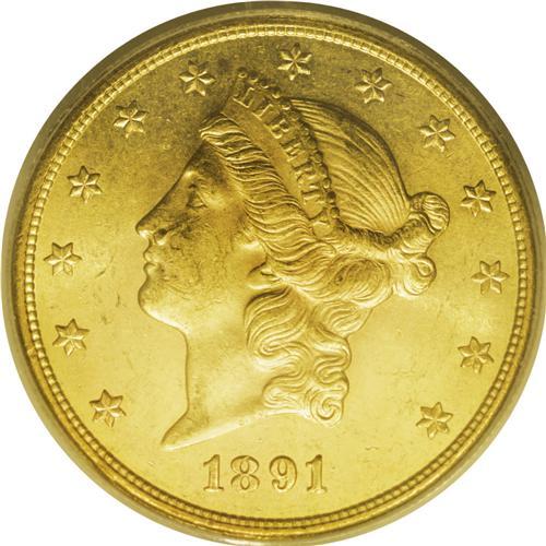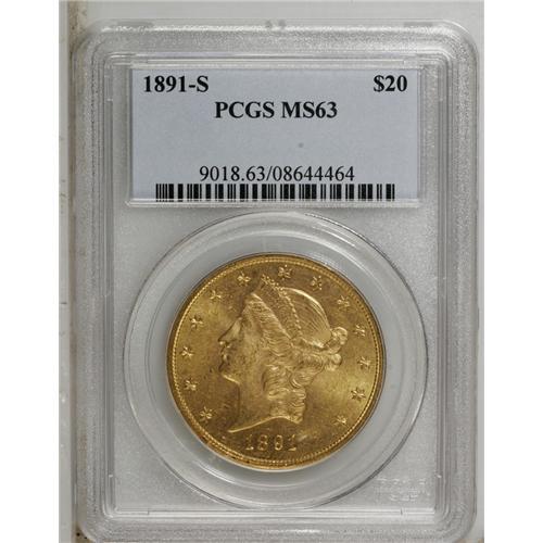 <B>1891-S<$20> MS63 PCGS.</B></I> The yellow-orange fields are considerably prooflike on this piece underneath a bit of light field chatter. The obverse strike is fairly bold, but the eagle's claws are somewhat softly struck. An appealing piece, and a rare issue any finer. PCGS has graded 73 examples finer (9/06).
