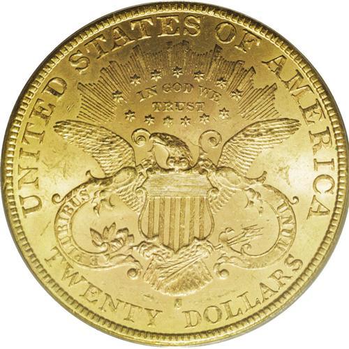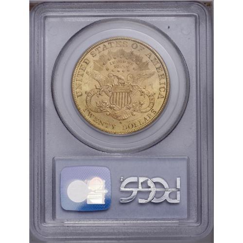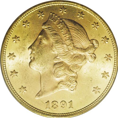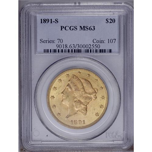 <B>1891-S $20 MS63 PCGS.</B></I> While the 1891-S is one of the more readily obtainable double eagles produced prior to 1895, it is a conditionally rare issue in the finer Mint State grades. Both sides of this piece are predominantly orange-gold in color, but blushes of green-gold tinting are noted at a few angles. Sharply struck throughout with flowing luster that thins to modest brightness in the reverse field. A group of small abrasions is seen in the right obverse field.<BR><BR><b>Shipping:</b> Coin/Currency (<a target="_blank" href="http://www.heritageauctions.com/common/shipping.php">view shipping information</a>)