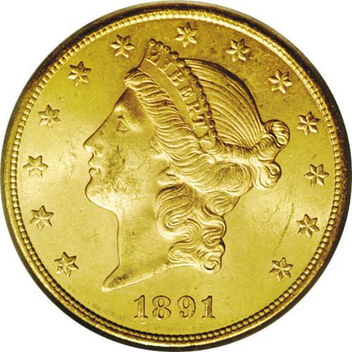 <B>1891-S<$20> MS64 PCGS.</B></I> An important offering as this date, common in lower grades, is rarely offered in Choice Mint State grades and essentially non-existent any finer. It is sharply struck with frosty yellow luster and excellent surfaces. The obverse field is slightly reflective in appearance. The present sale actually has two MS64 grade examples of this date. Population: 71 in 64, 0 finer (4/06).