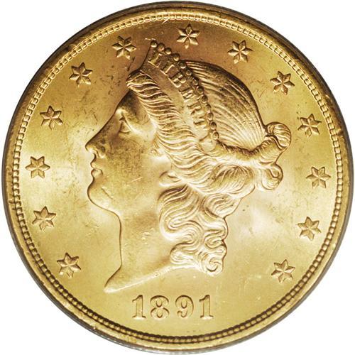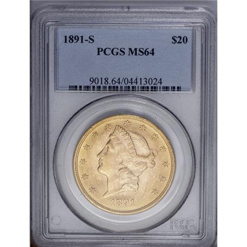 <B>1891-S $20 MS64 PCGS.</B></I> Another example of the underrated Type Three S-mint issues, this piece shows lovely straw-gold centers with a dusky overlay around the peripheries. The strike is bold, and the only mentionable abrasion is a tick on Liberty's cheek that limits a higher grade. An appealing and collectible specimen. There are none graded finer at PCGS (1/06).