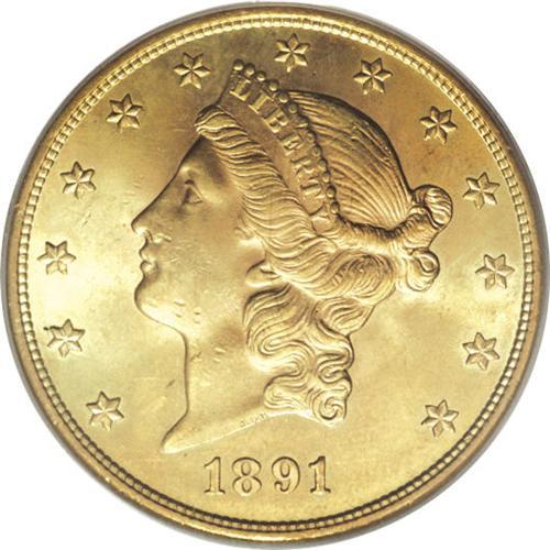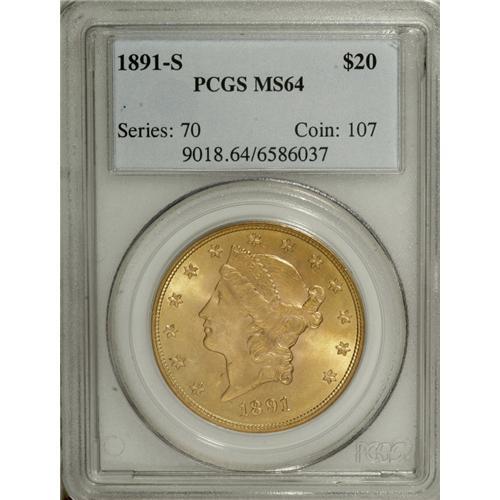 <B>1891-S $20 MS64 PCGS.</B></I> While the 1891-S was produced in large numbers, many have suffered as a result of their heavy use in international trade. The exceptional near-Gem in this lot displays swirling luster and attractive apricot-gold and mint-green patination. All of the design features have benefited from a powerful strike, and just a few minor marks preclude a higher grade. Population: 65 in 64, 0 finer (4/07).<BR><BR><b>Shipping:</b> Coins & Currency (<a target="_blank" href="http://www.heritageauctions.com/common/shipping.php">view shipping information</a>)