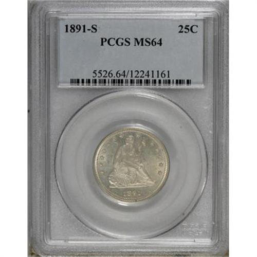 <B>1891-S 25C MS64 PCGS.</B></I> . PCGS Population (35/16). NGC Census: (49/15). Mintage: 2,216,000. Numismedia Wsl. Price for NGC/PCGS coin in MS64: $725. (#5526)<BR><BR><B>Coin Engraver:</B> Christian Gobrecht<BR><BR><b>Shipping:</b> Coins & Currency (<a target="_blank" href="http://www.heritageauctions.com/common/shipping.php">view shipping information</a>)
