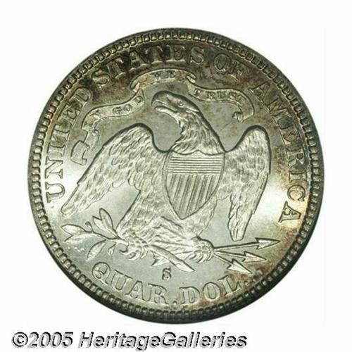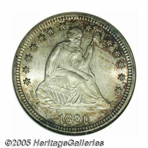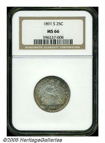 <B>1891-S<25C> MS66 NGC.</B></I> This final year Seated Liberty issue has a comparatively high mintage of more 2.2 million pieces, but the number of Mint State survivors, especially high quality ones, is surprisingly limited. This impeccable, wholly original example is at least partially framed in golden-russet toning and has a captivating frosty appearance. Population: 4 in 66, 0 finer (4/05).
