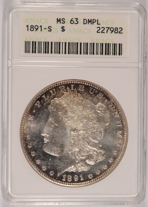 1891-S MORGAN SILVER DOLLAR, ANACS MS-63 DMPL RARE!!!