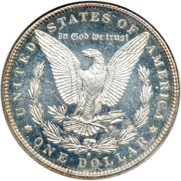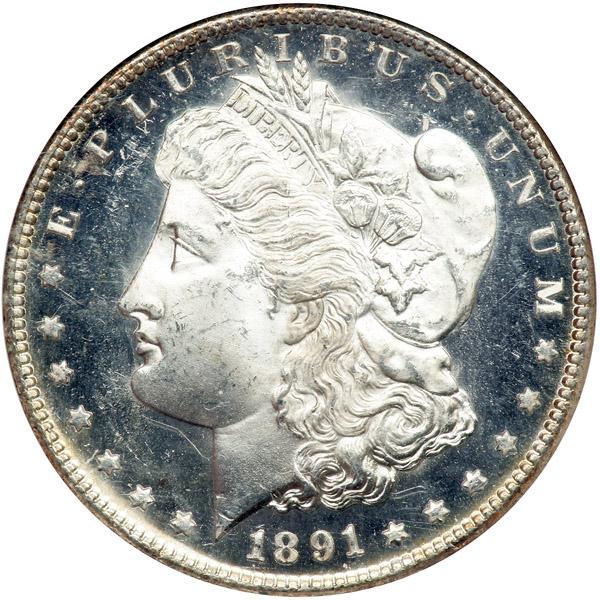 1891-S Morgan Dollar. NGC graded MS-65 DPL. A stunning white coin. And a solid Gem coin whose lustrous fields are untoned and only mildly abraded; excellent silver color. The strike is strong, with clear definition to the high points. Pop 5; none finer at NGC (PCGS # 97211) .