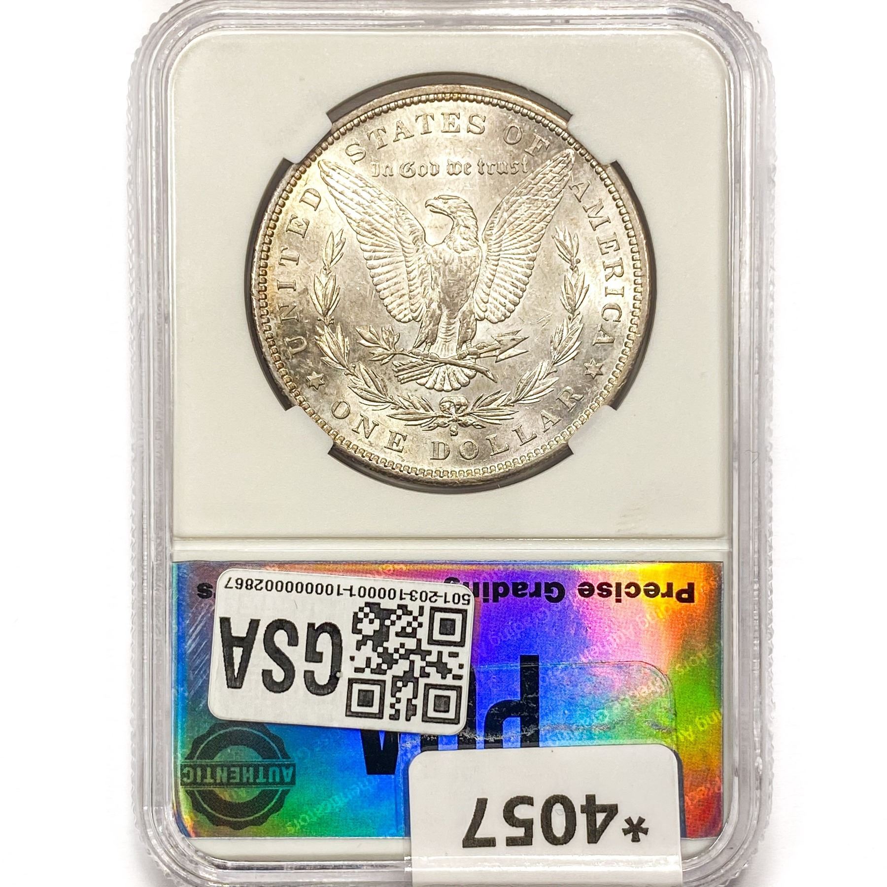 COINS AND CURRENCY LISTED IN GSA’S CATALOG AS GRADED AND ENCAPSULATED BY PCGS, NGC, ANACS, ICG, PCGS CURRENCY, PMG, PCGS BANKNOTE GRADING, CMC OR ANY OTHER THIRD-PARTY GRADING SERVICE ARE LIKEWISE SOLD “AS-IS” EXCEPT AS EXPRESSLY SET FORTH HEREIN. ALL THIRD-PARTY GRADING SERVICE GUARANTEES, INCLUDING AUTHENTICITY, ARE THE SOLE RESPONSIBILITY OF THE THIRD-PARTY GRADING SERVICE AND NOT WARRANTIES OR GUARANTEES OF GSA. BIDDERS SHOULD CONTACT THESE THIRD-PARTY GRADING SERVICES DIRECTLY WITH RESPECT TO ANY CLAIMS OR QUESTIONS THEY MAY HAVE CONCERNING THEIR GUARANTEES AND WARRANTIES. BIDDERS ACKNOWLEDGE AND AGREE THAT AUCTIONEER IS NOT BOUND BY OR LIABLE FOR ANY OPINION OR CERTIFICATION BY ANY THIRD-PARTY GRADING SERVICE. REMOVAL OF A PRODUCT FROM ITS PROTECTIVE CASING OR HOLDER OR ALTERATION OF ANY COIN HOLDER WAIVES ALL RIGHTS CONCERNING THE PRODUCT CONTAINED THEREIN.