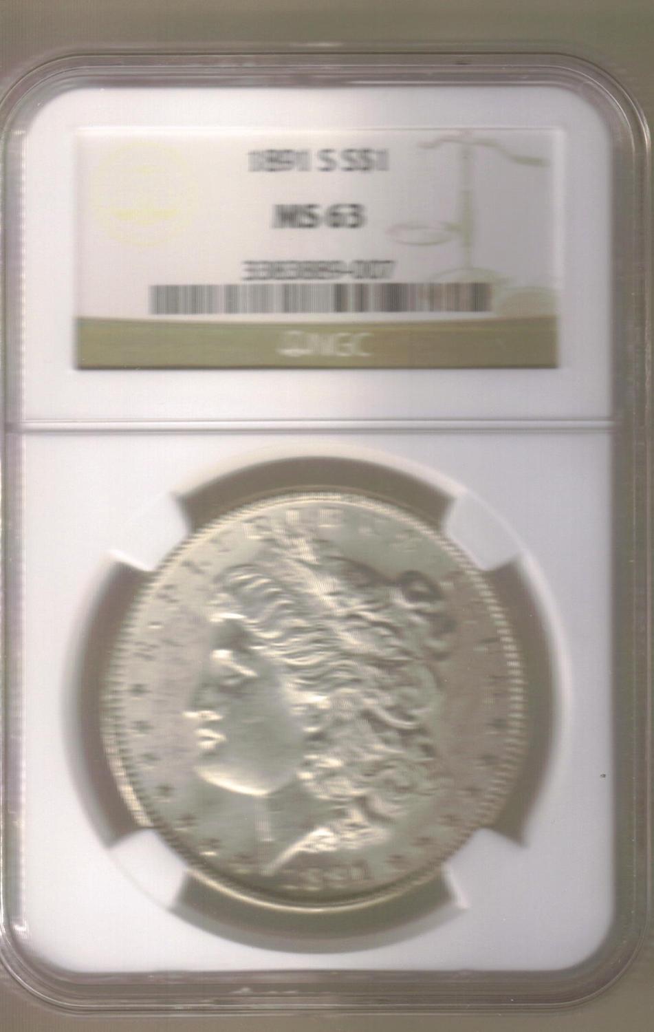 1891-S NGC MS-63 MORGAN DOLLAR WITH MINT ERRORS ( DOUBLED DATE, EYE LID, EAR & COTTON BLOSSEMS.)
