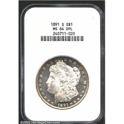 1891-S S$1 MS64 Deep Mirror Prooflike NGC. The periphery has violet, gold, and cobalt-blue patina, with light and milky tan color in the centers. Well struck with deeply mirrored fields that have good contrast with the frosty devices. An attractive near-Gem. Important notice: We expect to be auctioning lots at the rate of 200-250 per hour. Sometimes eBay Premier live bid software cannot keep up with that pace, so we strongly recommend that you place a realistic proxy bid now as insurance to avoid disappointment. Also please note that all Heritage/CAA lots purchased through eBay Premier carry a 20% Buyer's Premium.
