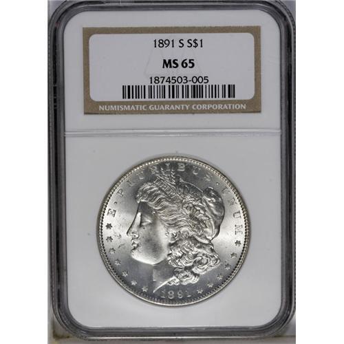 <B>1891-S<img border='0' src='http://www.heritagecoins.com/images/star.gif' width=10 height=10>$1> MS65 NGC.</B></I> This issue is characterized by great luster and a sharp strike, and this example does not disappoint. A brilliant Gem with a few small luster grazes on Liberty's cheek.<BR><I>From The Belle Glade Collection.</B></I>
