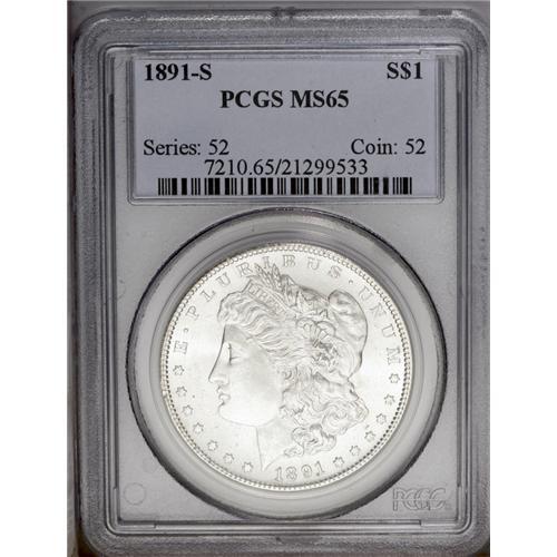 <B>1891-S<img border='0' src='http://www.heritagecoins.com/images/star.gif' width=10 height=10>$1 MS65 PCGS.</B></I> Highly lustrous with brilliant silver surfaces and exceptional eye appeal. The fields and devices are pristine and essentially mark-free. An outstanding Gem with few finer examples known. Population: 317 in 65, 52 finer (1/06).<BR><I>From The Leslie E. Lunsford Collection, #7 Current Finest Registry Morgan Dollars Basic Set, Circulation Strikes.</B></I>