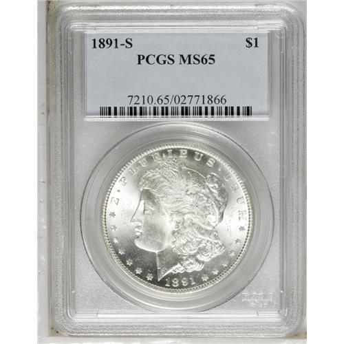 <B>1891-S<img border='0' src='http://www.heritagecoins.com/images/star.gif' width=10 height=10>$1> MS65 PCGS.</B></I> Sparkling mint frost blankets each side of this brilliant Gem. Well struck with clean, barely disturbed surfaces. A beautiful Morgan dollar.