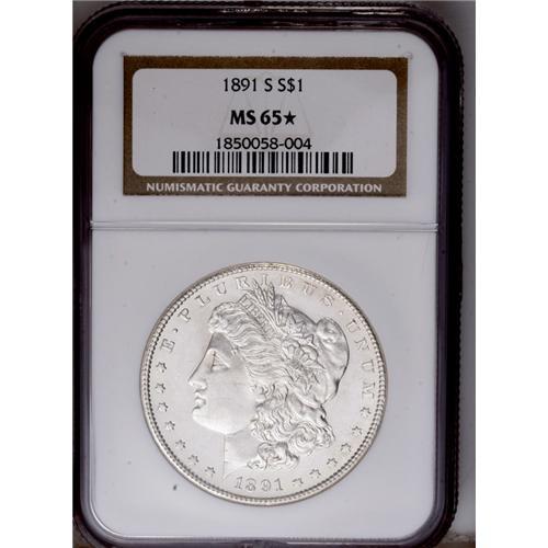 <B>1891-S<img border='0' src='http://www.heritagecoins.com/images/star.gif' width=10 height=10>$1> MS65 <img border='0' src='http://www.heritagecoins.com/images/star.gif' width=10 height=10> NGC.</B></I> Partially prooflike fields present a noticeable contrast with the sharply struck design elements. Impeccably preserved surfaces reveal just a wisp of light gold color at the margins. Exquisite quality, fully deserving of the coveted Star designation. <BR><BR><B>Important notice:</B> Heritage usually auctions material at the rate of 200-250 lots per hour. On some occasions eBay Live bid software or the Internet may not be able to keep up with the pace of the auction. We recommend placing a realistic absentee bid now as insurance to avoid disappointment. Occasionally the auctioneer may eliminate or reject an eBay Live bid, and the auctioneer may also reopen a lot after the close of the eBay live bidding (usually because we missed an audience bid), and may reject your bid even if it shows you as the winning bidder. By bidding via eBay Live, you agree that Heritage may award the lot to another bidder at its sole discretion under the circumstances described above or any other reasonable circumstances. Since eBay bids are not shown to us until we open the lot on the floor, we treat those bids just like floor bids. In most cases the floor responds before the eBay bid is presented to us, due to Internet lag time, so for consistency we have made it a policy that floor bids are always considered first over tie eBay live bids. Also please note that all Heritage lots purchased through eBay Live carry a 20% Buyer's Premium. Please make sure you read the Terms and Conditions before you bid. This lot is being auctioned in conjunction with a live floor auction by Heritage Galleries & Auctioneers. All final auction and invoice information will be supplied by Heritage Galleries & Auctioneers, and all other information should be considered preliminary. Lot:3587 <BR><BR><B>Winning Notification and Billing:</B> After the FINAL session in this auction is complete, Heritage will send e-mail and snail mail invoices. This process normally takes several days. All final auction and invoice information will be supplied by Heritage Galleries & Auctioneers, and all other information should be considered preliminary. <BR><BR>This auction will be conducted on a live auction floor and over the Internet through eBay Live. If you choose to place an absentee bid, please take a moment to <font color='#0000ff'><u><a href='http://pages.ebay.com/liveauctions/help/before/laabsentee.html'>learn how eBay Live absentee bidding works</a></u></font><font color='#000000'>