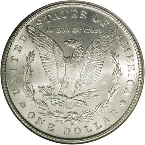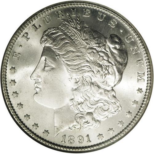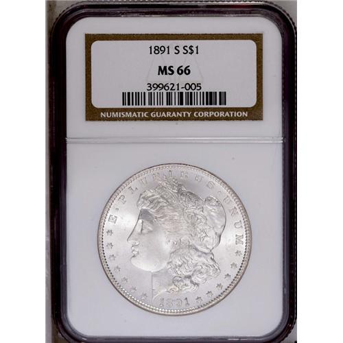 <B>1891-S<img border='0' src='http://www.heritagecoins.com/images/star.gif' width=10 height=10>$1> MS66 NGC.</B></I> Most certified Mint State specimens of the 1891-S are in the MS63 and MS64 grade categories, where about 3,200 coins have been graded by NGC and PCGS. Around 500 full Gems have been certified, and fewer than 75 Premium Gems. The MS66 example presented here displays radiantly lustrous silver-gray surfaces. The design features are well defined, including good delineation in the hair over Liberty's ear. Minor luster grazes on the cheek and neck and in the reverse fields prevent an even higher grade.
