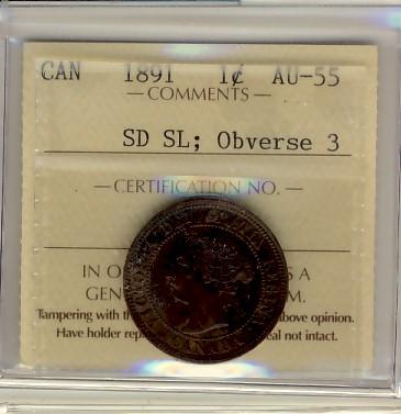 1891 SD SL Obv 3 1¢ ICCS AU55