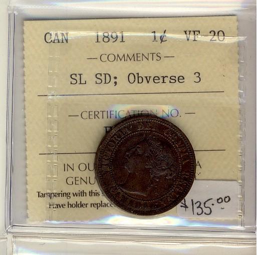 1891 SD SL Obv 3 1¢ ICCS VF20