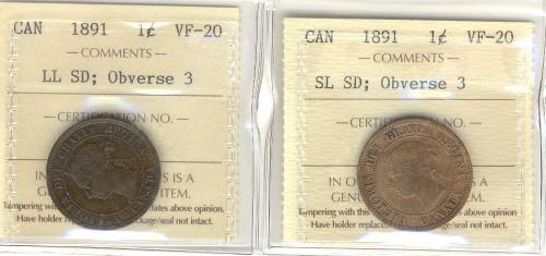 1891 SDLL Obv.#3 , 1891 SDSL Obv.#3 both coins ICCS VF20.