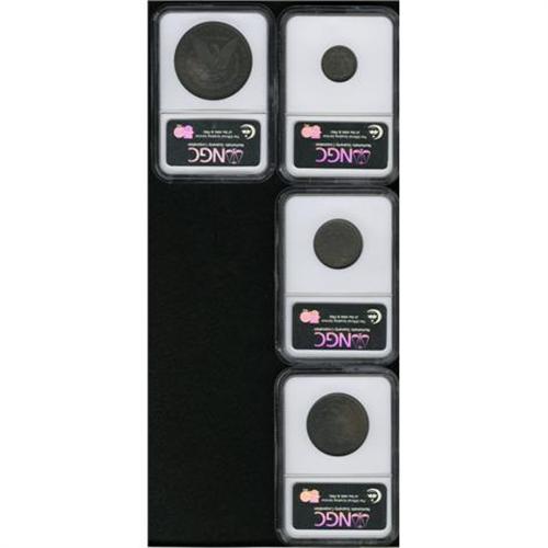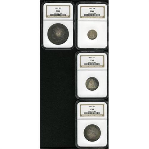 <B>1891 Silver Proof Set. PR66 NGC.</B></I> Each of the four coins in this set are similarly graded by NGC as PR66. All four pieces have cameo contrast, but none are designated as Cameo proofs. Each of these pieces are similarly toned and appear to be nicely matched. The following are included:<BR><BR><B>Dime.</B></I> The obverse of this piece has light silver-gray color that is accented by hints of rose toning at the borders. The reverse is deeply toned in steel and sea-green. Both sides have deeply mirrored fields with lustrous devices that combines to create light cameo contrast.<BR><BR><B>Quarter.</B></I> Most of the obverse on this cameo proof is brilliant white with a crescent of deep iridescence at the upper right. The reverse is fully toned in steel-blue and dark gray-gold.<BR><BR><B>Half Dollar.</B></I> A sharply struck Premium Gem proof, this piece is toned over most of the obverse and all of the reverse. Only a small area of the obverse at the immediate center has light silver color, gradually changing to light gold and deep blue and lilac. The reverse is fully toned in similar colors.<BR><BR><B>Silver Dollar.</B></I> This deeply toned example has a tiny patch of brilliant silver color at the center of the obverse. The balance on both sides is deep lilac and steel-blue.<BR><BR><b>Shipping:</b> Coins & Currency (<a target="_blank" href="http://www.heritageauctions.com/common/shipping.php">view shipping information</a>)