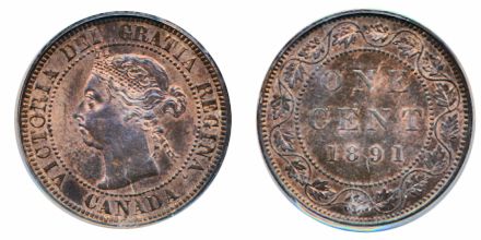 1891. Small Date, Small Leaves. Obverse port. #3. PCGS graded Mint State-64, Red-Brown. 40%/30% red luster on obverse/reverse.