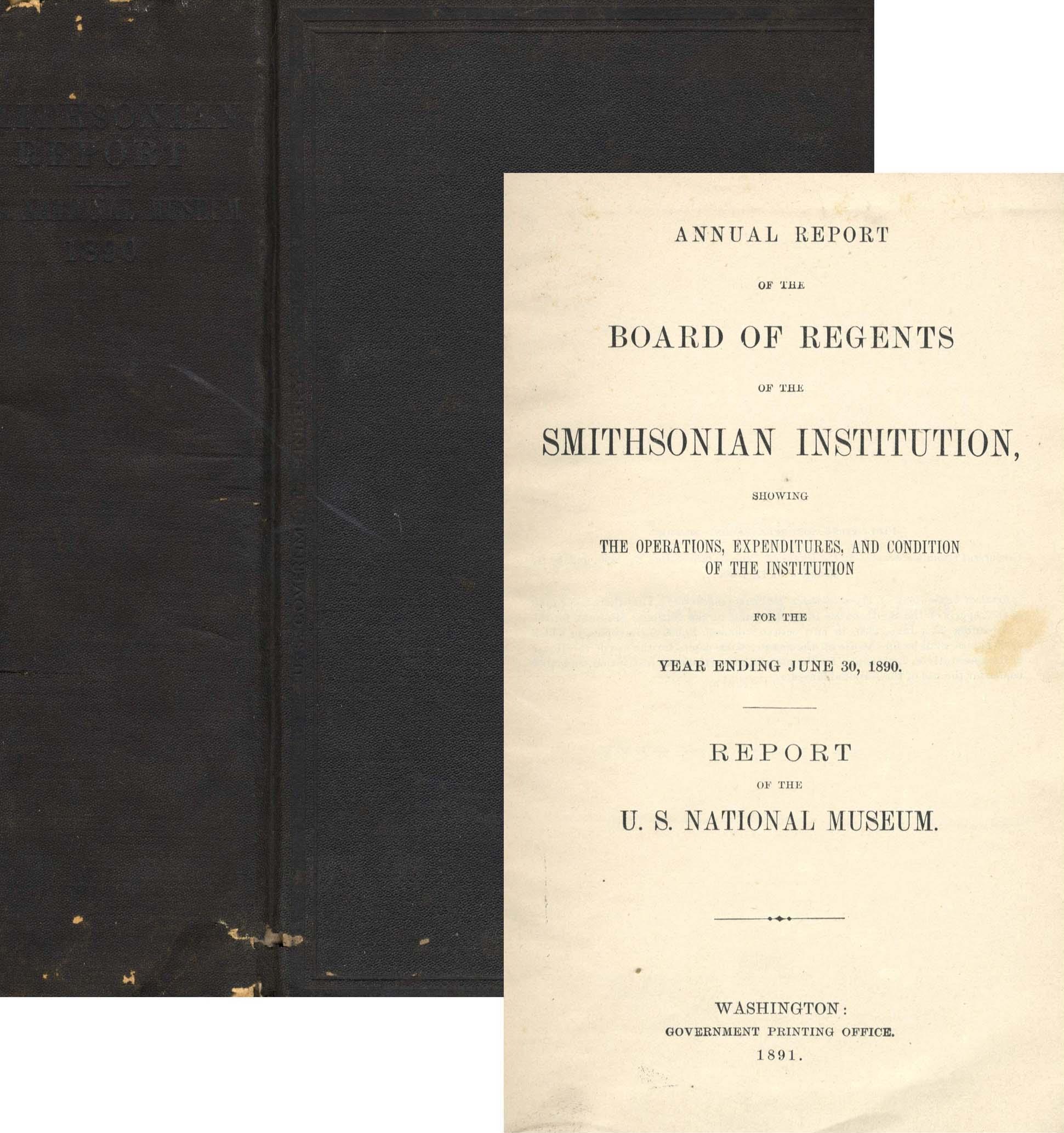 ''Annual Report of the Board of Regents of Smithsonian Institution Showing the Operations, Expenditures, and Condition of the Institution for the Year Ending June 30, 1890. Report of the U.S. National Museum.'' Washington: Government Printing Office: 1891. Plates of Native-American paintings by artist George Catlin. Hardcover. Book, measuring 6'' x 8'', runs 811pp. Black cloth boards show wear, ex-libris. Loose binding, some separation to interior yet book overall intact. Good condition. An amazing period text.