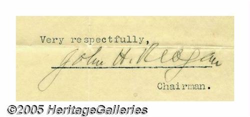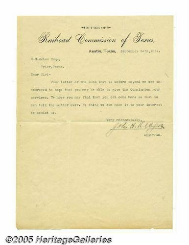 <B>1891 Texas Railroad Commission Typed Letter Signed by John H. Reagan</B></I> One page typed letter, Austin, Texas, dated September 24, 1891 and signed by Reagan. Routine content. Reagan had a long and interesting career. Born in Tennessee, he moved to Texas in 1839 and joined General Rusk's regiment of Indian fighters. By 1842 he was elected Captain of the Militia and was Justice of the Peace in Nacogdoches County. In 1847, he was elected to the Texas House and then worked as an attorney. Elected to the U.S. Congress in 1857, he served until Texas seceded in 1861. He was appointed a delegate to the Convention in Montgomery that formed the Confederacy and then became Postmaster General of the Confederate States of America. He was the last remaining member of Jefferson Davis' cabinet with him when he was captured in May 1865. After some time in prison, he returned to Texas and resumed his political career. Reagan served in the 1876 Convention that framed the present Constitution of Texas. He was again elected to the U.S. Congress as a Representative and then Senator. Interested in the Railroad, he resigned his seat in the Senate in 1891 to accept an appointment to the newly established Texas Railroad Commission where he served for 11 years. This TLS is in fine condition with original mailing folds. Lot:253