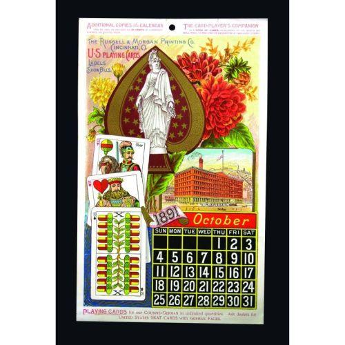 1891 October Calendar Page for US Playing Cards, The Russell and Morgan Printing Company, Cincinnati, OH. Excellent condition. 8 X 12 1/2 inches.