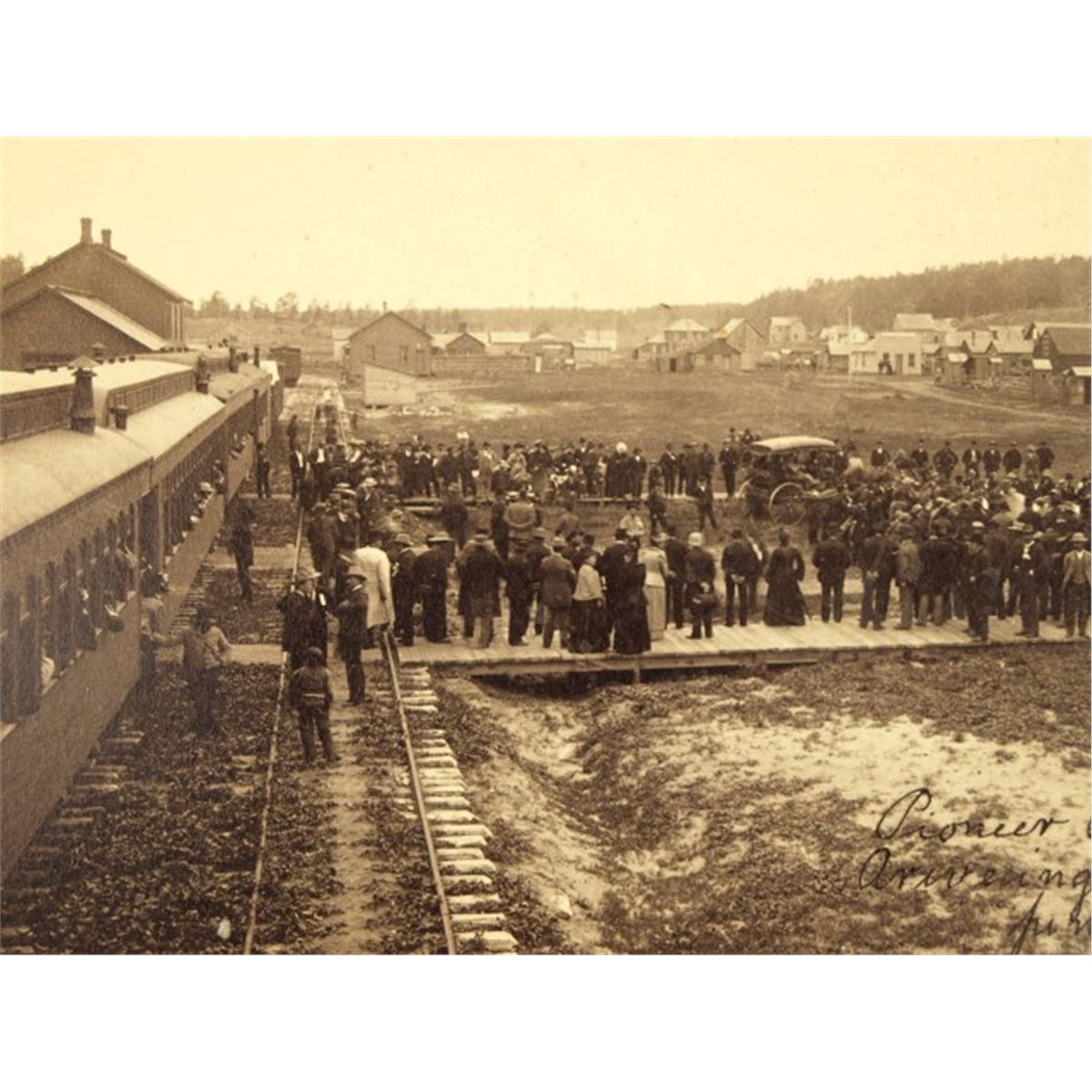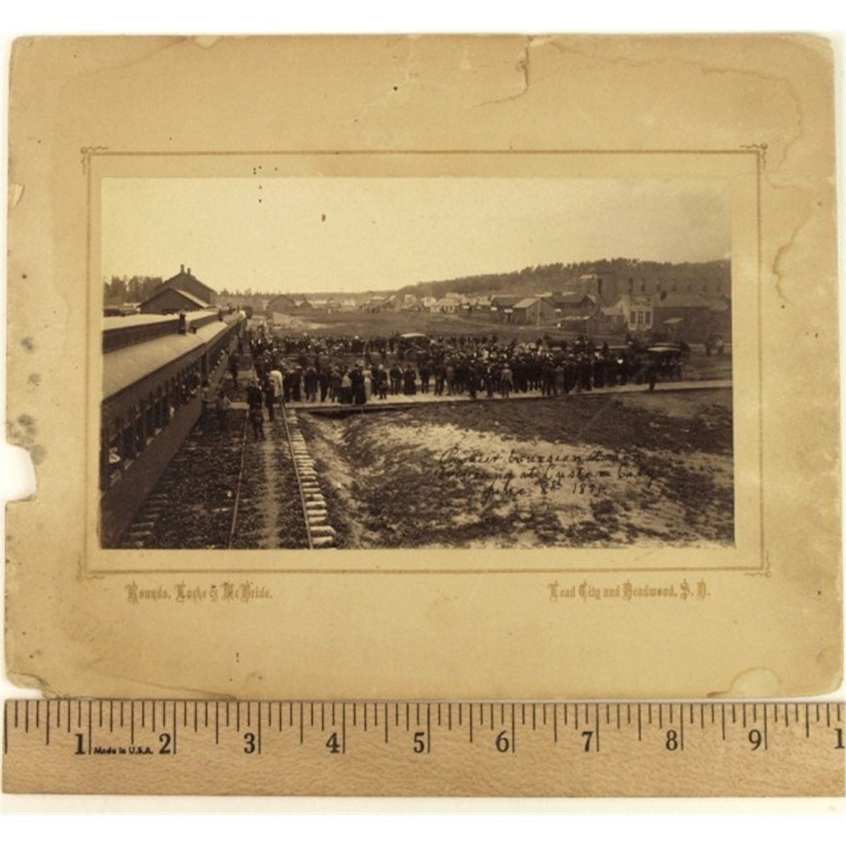 1891 dated photograph of Pioneer excursion train arriving at Custer City South Dakota on June 8th, photo by Rounds Locke and McBride of Lead City in Deadwood, 8" X 10".