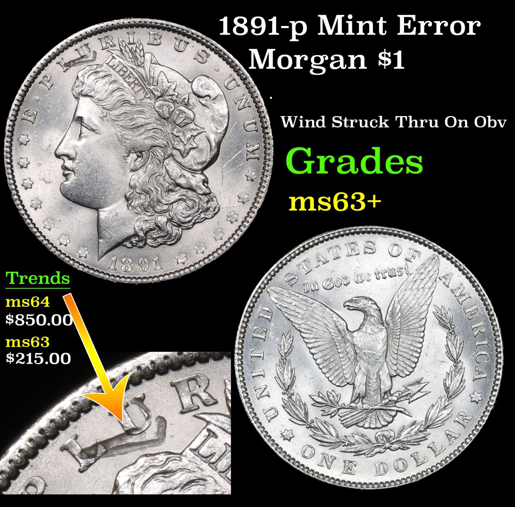 1891-p Mint Error . Wind Struck Thru On Obv Morgan Dollar $1 Grades Select+ Unc. A Corey's Pick