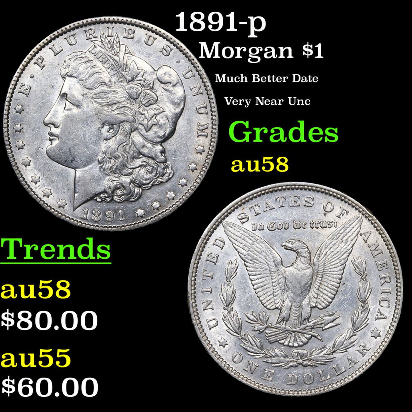 1891-p Morgan Dollar $1 Grades Choice AU/BU Slider.
