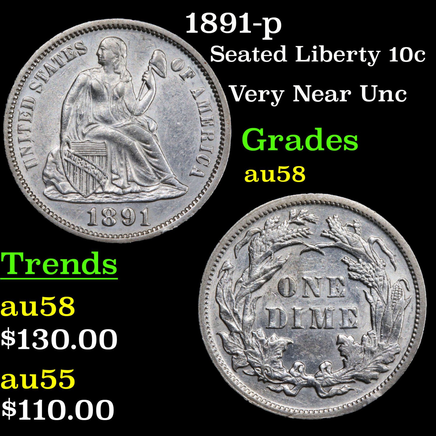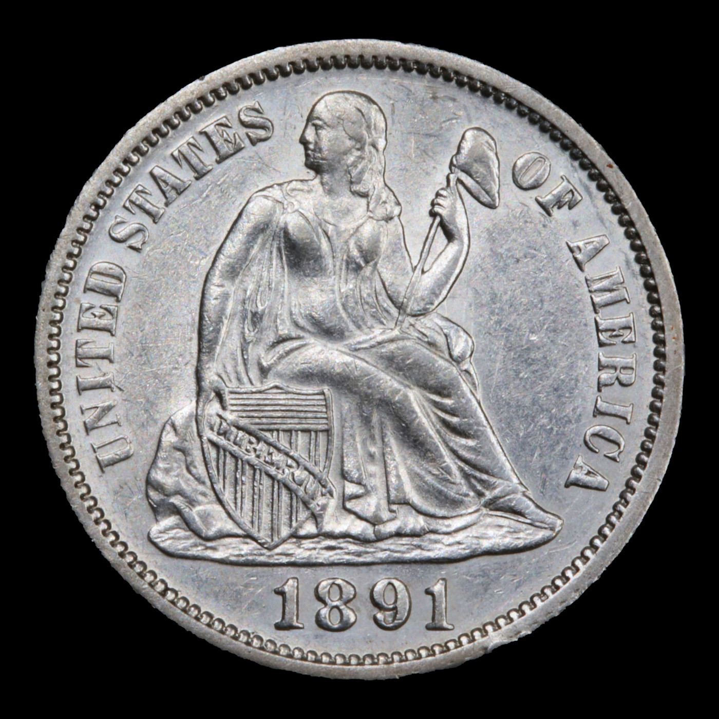 1891-p Seated Liberty Dime 10c Grades Choice AU/BU Slider.