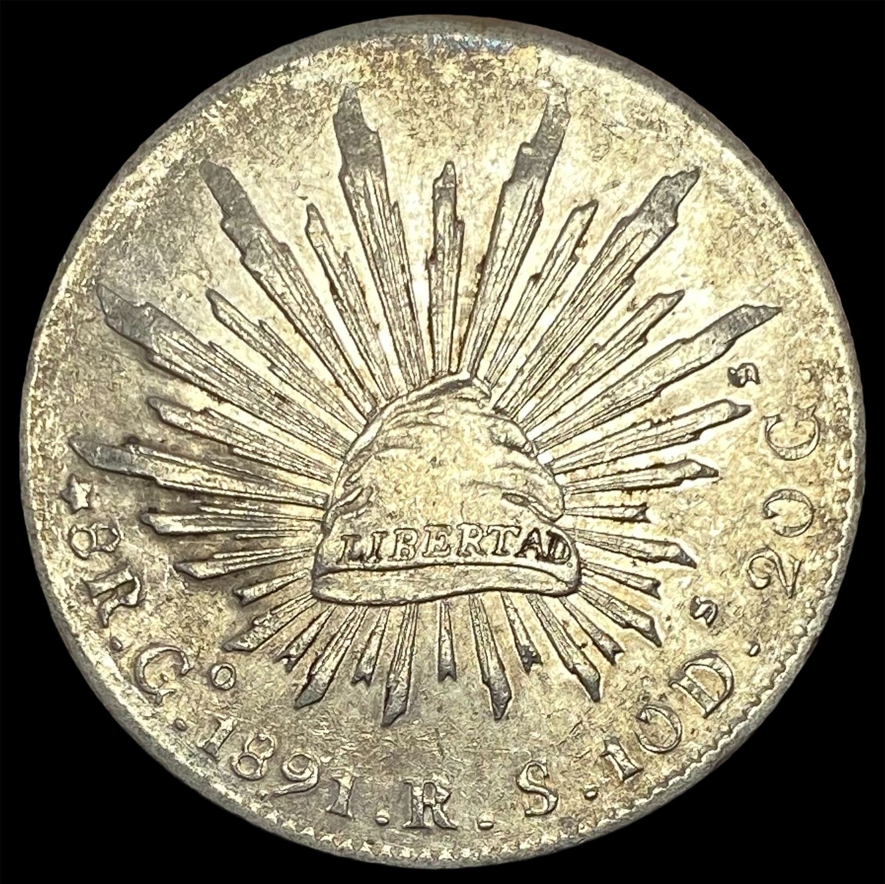 1891Go RS Mexico Silver 8 Reales Cap and Rays CLOSELY UNCIRCULATED