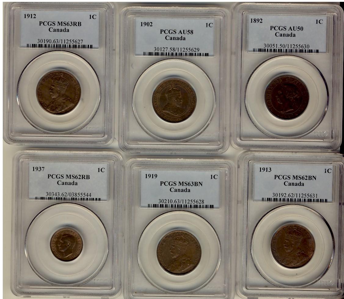 1892 1¢ AU50, 1902 AU58, 1912 MS63RB, 1913 MS62BN, 1919 MS63Bn & 1937 MS62RB. Lot of 6 coins all PCGS graded.