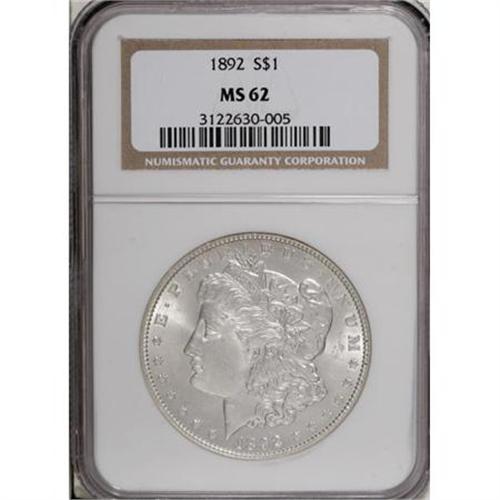 <B>1892 $1 MS62 NGC.</B></I> . NGC Census: (414/1614). PCGS Population (656/2822). Mintage: 1,037,245. Numismedia Wsl. Price for NGC/PCGS coin in MS62: $208. (#7212)<BR><BR><B>Coin Engraver:</B> George T. Morgan<BR><BR><b>Shipping:</b> Coins & Currency (<a target="_blank" href="http://www.heritageauctions.com/common/shipping.php">view shipping information</a>)