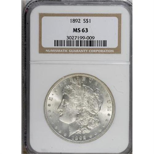 <B>1892 $1 MS63 NGC.</B></I> NGC Census: (844/726). PCGS Population (1422/1352). Mintage: 1,037,245. Numismedia Wsl. Price for NGC/PCGS coin in MS63: $350. (#7212)<BR><BR><B>Coin Engraver:</B> George T. Morgan<BR><BR><b>Shipping:</b> Coins & Currency (<a target="_blank" href="http://www.heritageauctions.com/common/shipping.php">view shipping information</a>)
