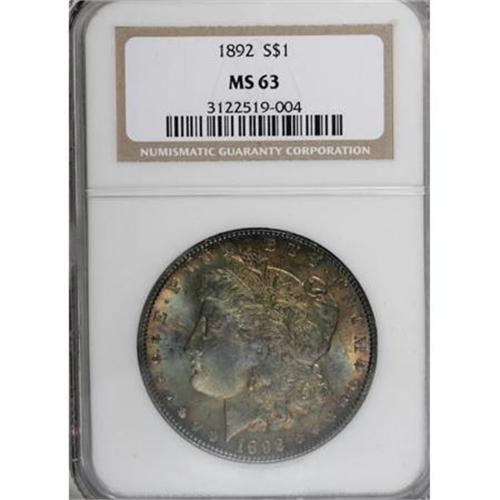 <B>1892 $1 MS63 NGC.</B></I> NGC Census: (864/736). PCGS Population (1437/1372). Mintage: 1,037,245. Numismedia Wsl. Price for NGC/PCGS coin in MS63: $350. (#7212)<BR><BR><B>Coin Engraver:</B> George T. Morgan<BR><BR><b>Shipping:</b> Coins & Currency (<a target="_blank" href="http://www.heritageauctions.com/common/shipping.php">view shipping information</a>)