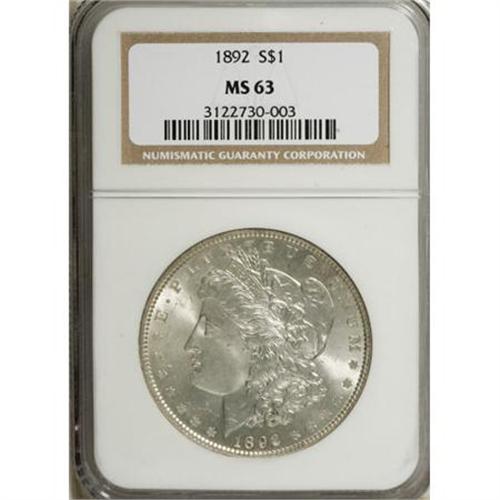 <B>1892 $1 MS63 NGC.</B></I> . NGC Census: (872/743). PCGS Population (1441/1395). Mintage: 1,037,245. Numismedia Wsl. Price for NGC/PCGS coin in MS63: $350. (#7212)<BR><BR><B>Coin Engraver:</B> George T. Morgan<BR><BR><b>Shipping:</b> Coins & Currency (<a target="_blank" href="http://www.heritageauctions.com/common/shipping.php">view shipping information</a>)