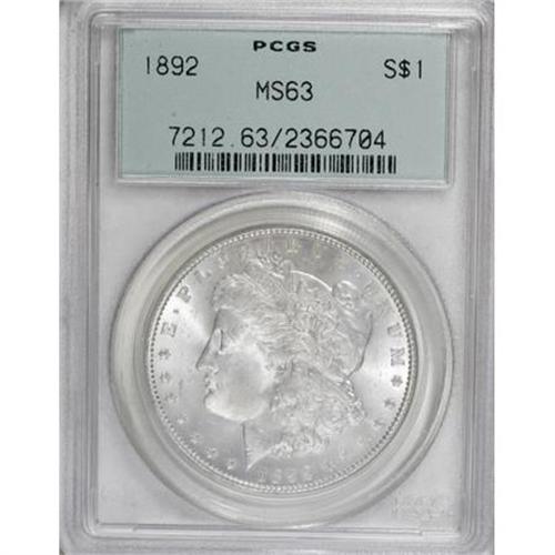 <B>1892 $1 MS63 PCGS.</B></I> PCGS Population (1437/1372). NGC Census: (866/736). Mintage: 1,037,245. Numismedia Wsl. Price for NGC/PCGS coin in MS63: $350. (#7212)<BR><BR><B>Coin Engraver:</B> George T. Morgan<BR><BR><b>Shipping:</b> Coins & Currency (<a target="_blank" href="http://www.heritageauctions.com/common/shipping.php">view shipping information</a>)